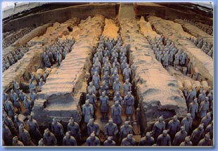 Life size terracotta figures of warriors and horses arranged in battle formations are the replicas of the imperial guard of those days. The terracotta soldiers are remarkably realistic sculptures. The figures are mostly of 1.8 - meter height with low part of the body being solid and the upper part – hollow. Originally the figures were painted in bright colors however they faded and worn off during 2000 years. The squarish faces of the warriors feature broad foreheads and wide, thick-lipped mouths. The warriors look far a away. The muscular horses have big bright eyes, large nostrils, stout legs, plump waists and hips. They are poised to gallop.