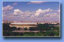Let's go to the Sparrow Hills (Vorobyovy Gory) now to get the best view of the city. You'll overlook the city from the hill of 85 meters high and see the greater part of Moscow: the wide loop of Moskva river with the gentle slope of the Sparrow Hills continuing on the left, the housing estates behind the Mosfilm Studios, the Kiev Raiway Station, the tower of the Hotel Ukraine, the golden domes of the Novodevichy Convent and of the Kremlin cathedrals (which are visible in good weather),